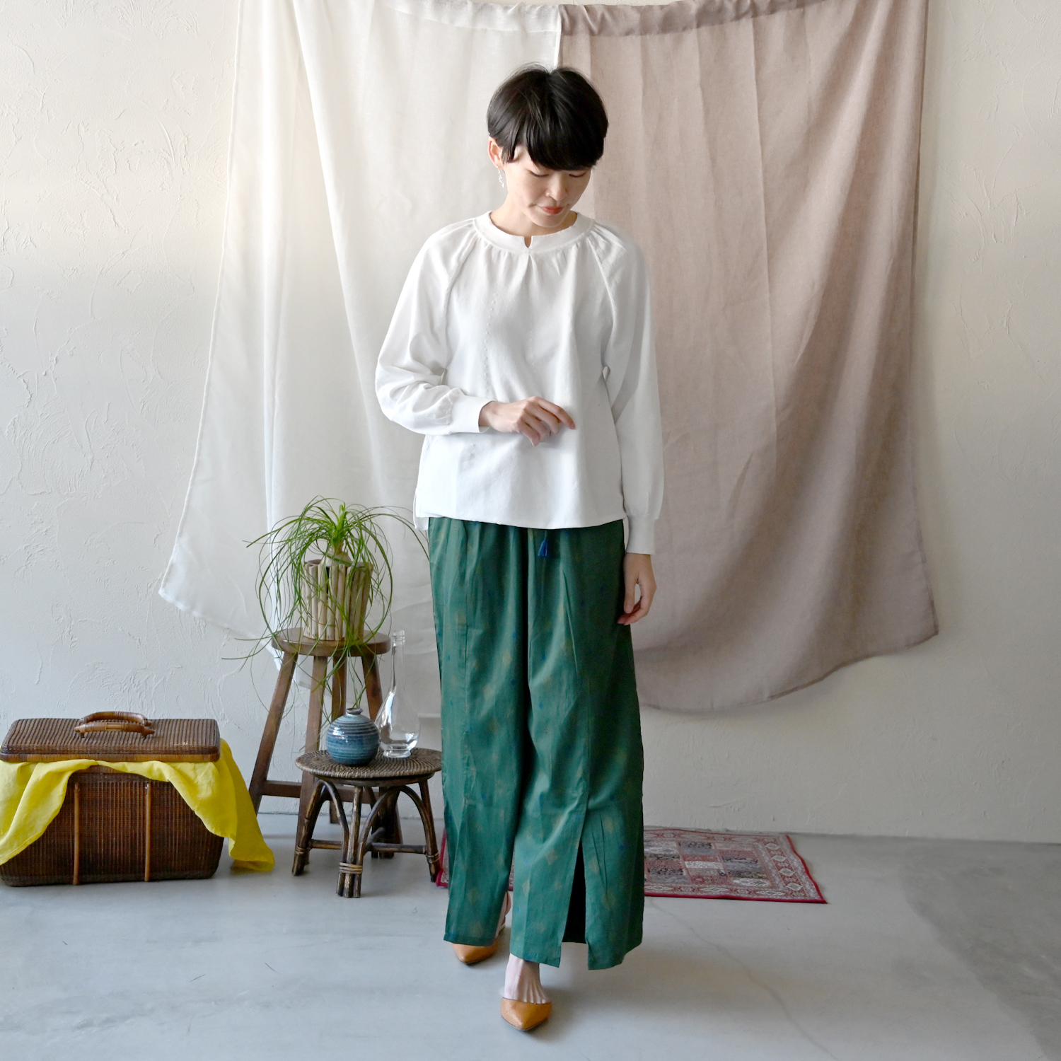 全体的に甘すぎないように、鮮やかな緑のパンツをアクセントにして