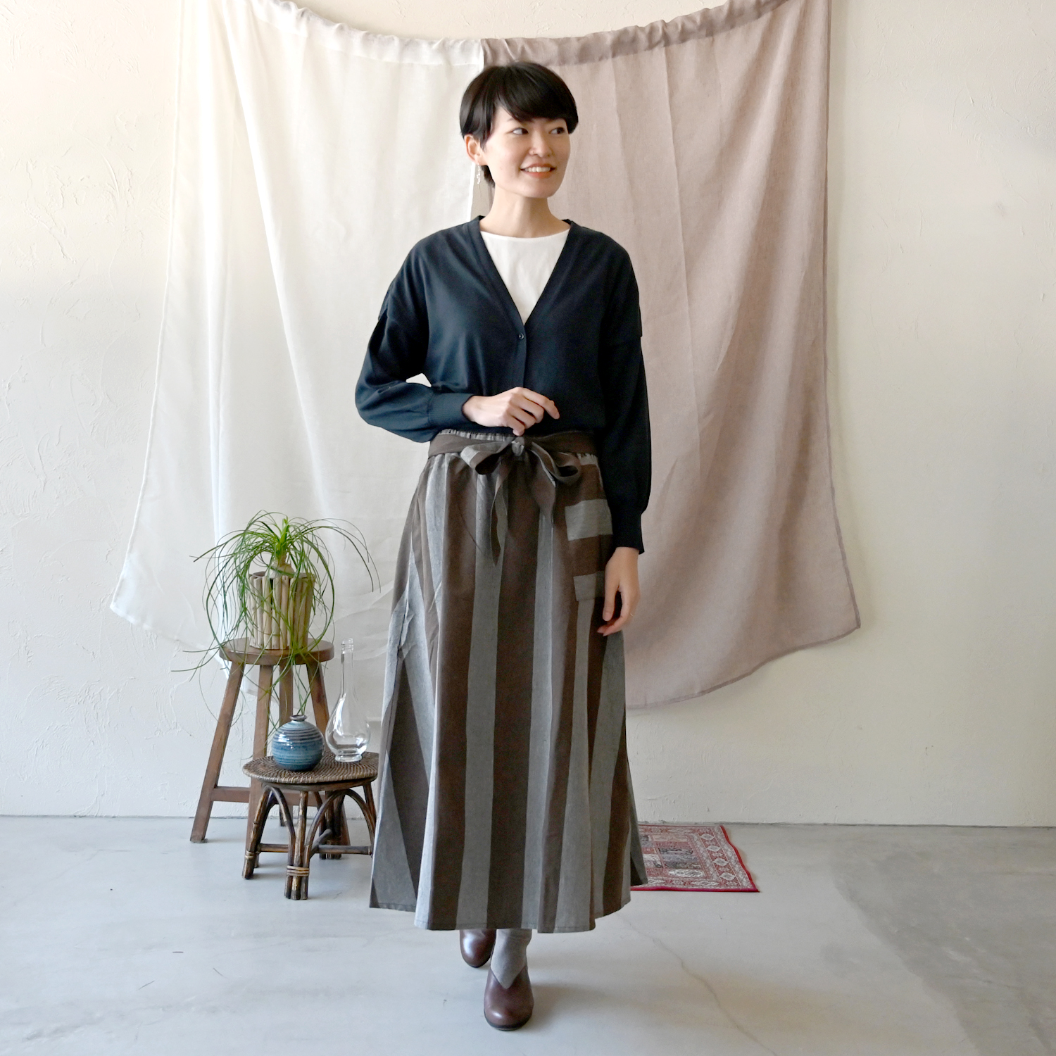 168cm長身スタッフは、柄物を合わせて。